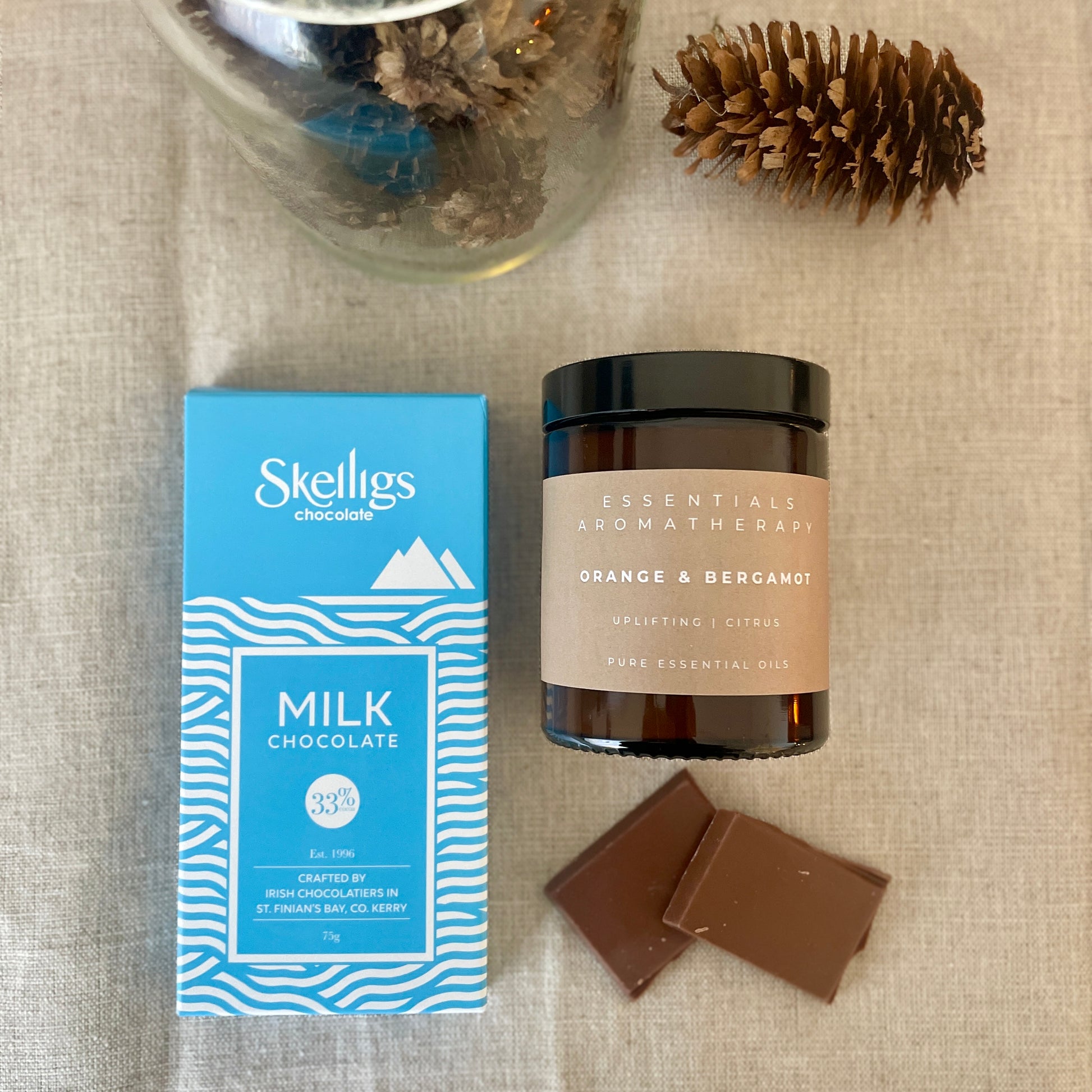 Treat yourself or delight someone special with the ultimate comfort pairing. This thoughtfully curated bundle combines our aromatic essential oil candle with a decadent bar of artisan Irish chocolate—a sensory experience designed to soothe the soul and elevate everyday moments into something truly indulgent. Price to buy separately €26.45.
